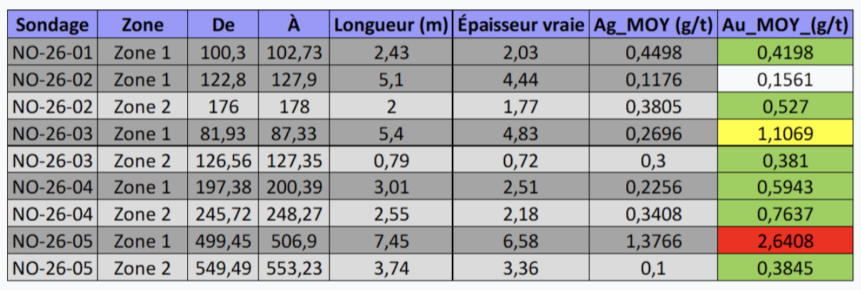 Enfin, NO-26-05 est un forage de densification réalisé le long du principal filon minéralisé à fort pendage, au-dessus du forage NO-25-13 (4,10 g/t Au sur 7,1 m). Il a recoupé la zone 1 à une profondeur verticale de 400 m et a donné 2,64 g/t Au sur 7,45 m (épaisseur réelle : 6,58 m). Ce résultat confirme la bonne minéralisation de la zone 1 le long du filon minéralisé principal interprété. La zone 2 a donné 0,38 g/t Au sur 3,74 m (épaisseur réelle : 3,36 m). Il convient de noter que, pour tous les trous, les teneurs en argent sont systématiquement faibles; égales ou inférieures aux teneurs en or.